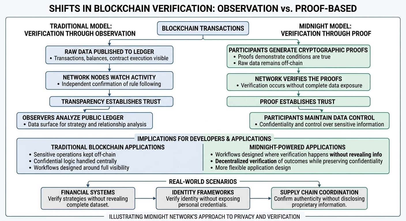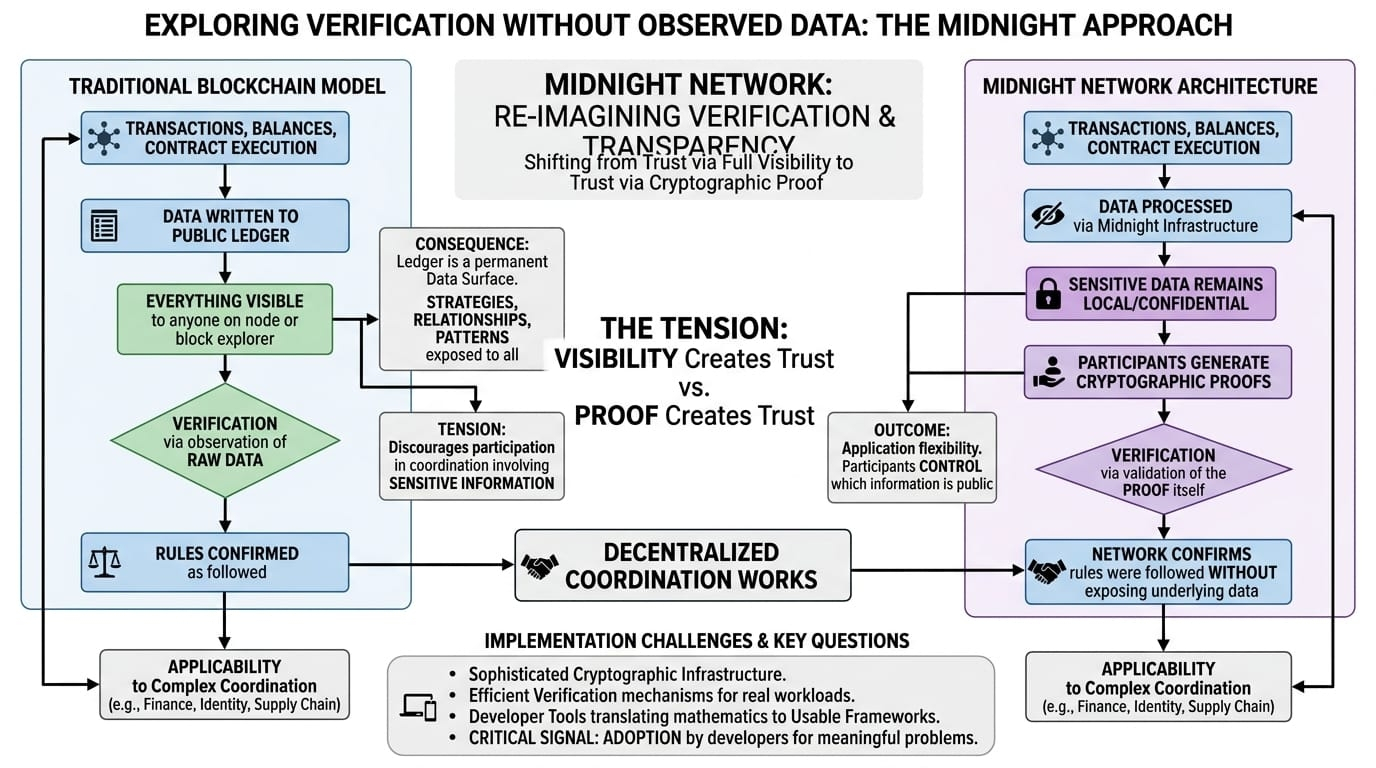 Instead of asking participants to reveal everything so the network can verify correctness, Midnight explores an architecture where verification can occur without requiring complete observation of the underlying data.