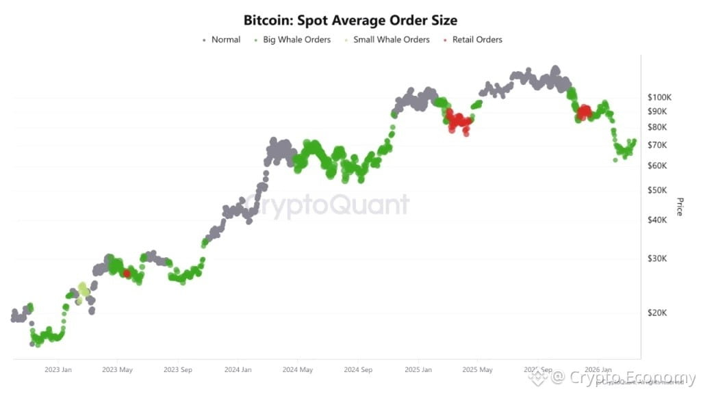 Un análisis separado de CryptoQuant, publicado por el analista Gideon Geoffery, refuerza esa lectura desde un ángulo diferente. El estudio clasifica las órdenes de Bitcoin al contado en cuatro categorías por tamaño y registra, desde enero de 2023, seis períodos en los que las grandes órdenes de ballenas dominaron el mercado. En los seis casos, esa dominancia precedió a considerables aumentos de precio.