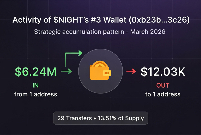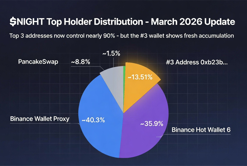 I refreshed BubbleMaps.io for $NIGHT this afternoon and the picture just got a lot more interesting. The overall cluster map still shows the familiar heavy Binance presence we saw last week, but clicking into the details uncovered something new: the third largest holder (0xb23b…3c26) now controls a solid 13.51% of the supply. That’s 45.01 million tokens worth roughly $2.34 million at current prices. With mainnet weeks away, this single address is suddenly telling us a lot about how big players are positioning themselves in the Midnight ecosystem.