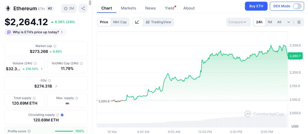 ETH se negocia a $2,264 después de subir un 7.6% según CoinMarketCap. Los vendedores estaban limitando la recuperación en el SMA de 50 días cerca de $2,100, pero el precio logró superarlo.