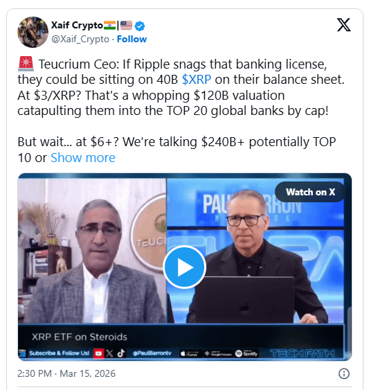 The post referenced comments from Sal Gilbertie, the chief executive of Teucrium, during an interview with Paul Barron. Gilbertie suggested that the company’s large holdings of XRP could place it among the world’s largest banks by capitalization under certain price scenarios.