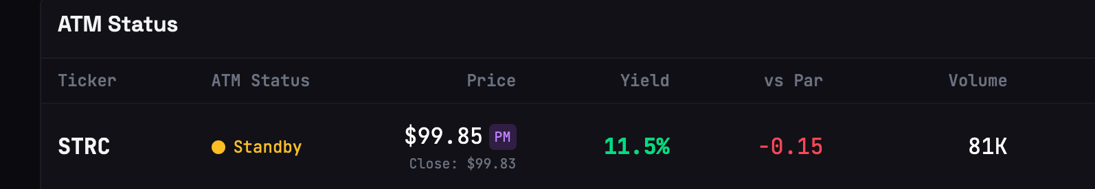 特点:永续优先股,固定利率11.5%,每月派息,面值100美元(低于这个面值,加利率,高于这个面值,就降低利率),只要STRC高于100美金,理论上可以用ATM机制一直发行。
