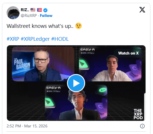 In the post, RIZ wrote, “Wall Street knows what’s up…” The tweet also included a video segment from the show The XRP Pod, in which host Paul Barron spoke with Dom Kwok about institutional activity connected to XRP exchange-traded funds.
