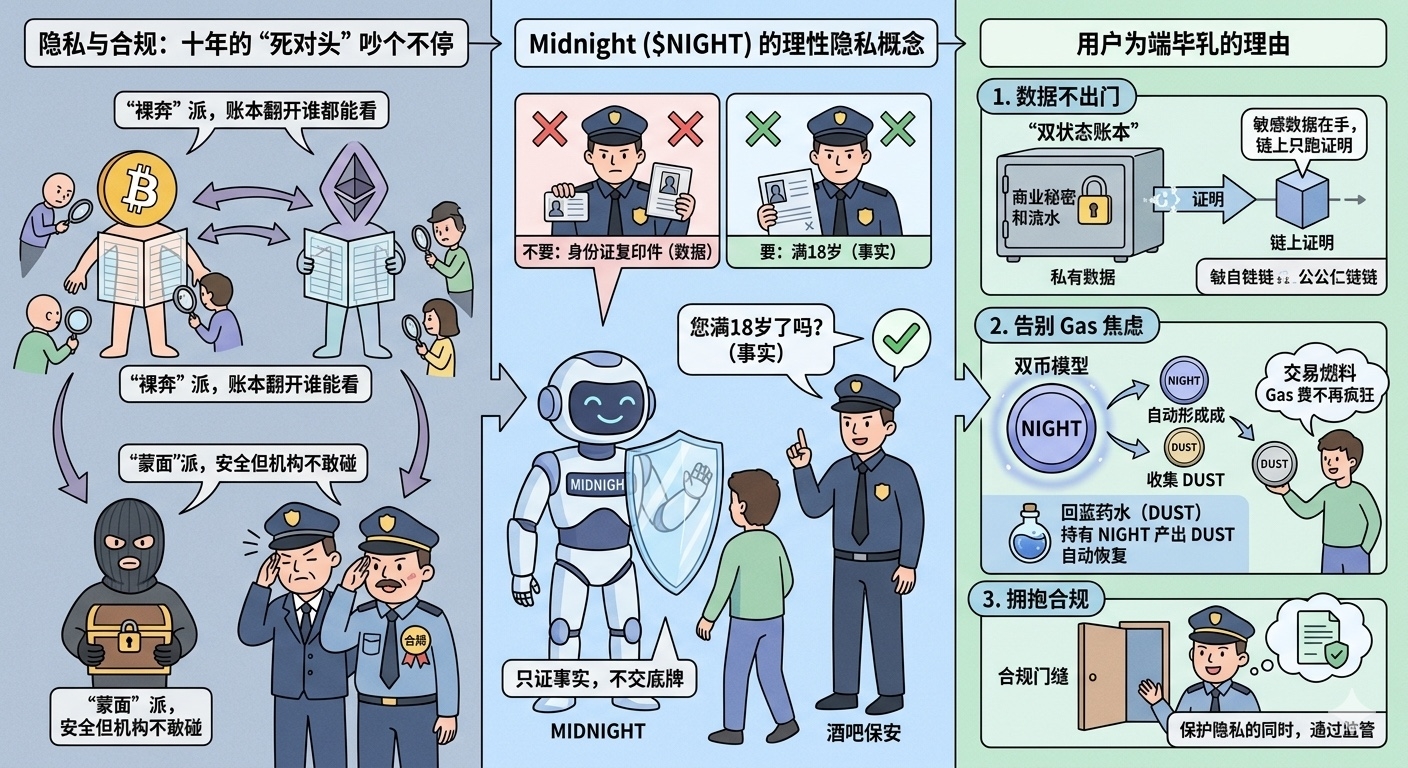 举个通俗的例子:你去酒吧,保安只要确认你满18岁就行,没必要非得把你身份证拿走复印一份。Midnight 搞的就是这套 ZK(零知识证明)逻辑。