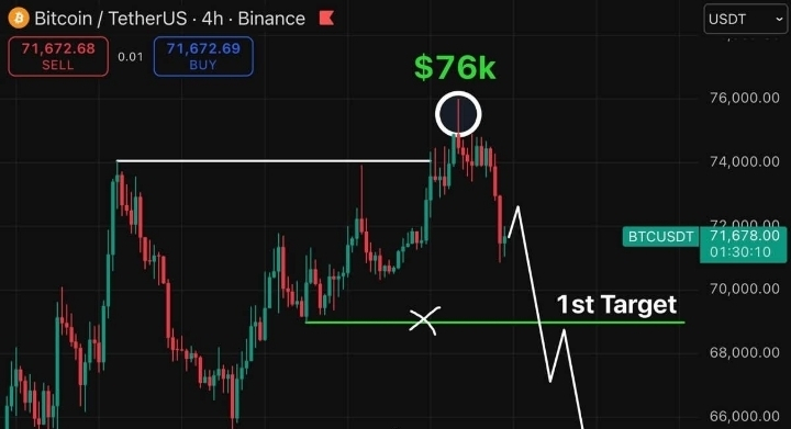 $BITCOIN #bitcoin Ha entregado un rechazo limpio desde la zona de 76K, cayendo hacia 71K en un movimiento estructurado.