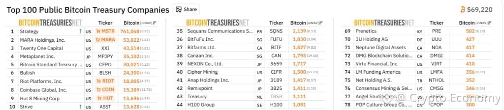 Strive, la firma fundada por Vivek Ramaswamy y listada en Nasdaq bajo el símbolo ASST, compró 317 BTC en la última semana y elevó su posición total a 13,627.9 BTC. Tras esa transacción, la compañía superó a CleanSpark y aseguró el décimo lugar entre los mayores tesoros públicos de bitcoin a nivel mundial, según datos de Bitcoin Treasuries.