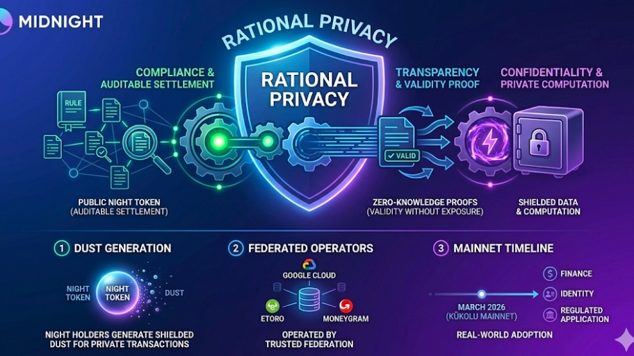 La visión estratégica más amplia detrás de Midnight es que el futuro de la adopción de blockchain probablemente no pertenezca completamente a sistemas donde todo es permanentemente visible, y probablemente tampoco pertenezca completamente a sistemas donde todo desaparece en una caja negra. Es más probable que pertenezca a sistemas que permiten a los usuarios, instituciones y aplicaciones revelar exactamente lo suficiente. La arquitectura de Midnight se construye en torno a esa suposición. La transparencia se preserva a través del token público NIGHT y la capa de liquidación auditable. La confidencialidad se maneja a través de ejecución de conocimiento cero, datos protegidos y divulgación selectiva. El cumplimiento se apoya a través de pruebas verificables, límites de privacidad controlados y un modelo de tarifas centrado en DUST no transferible en lugar de en la transferencia de valor anónima.