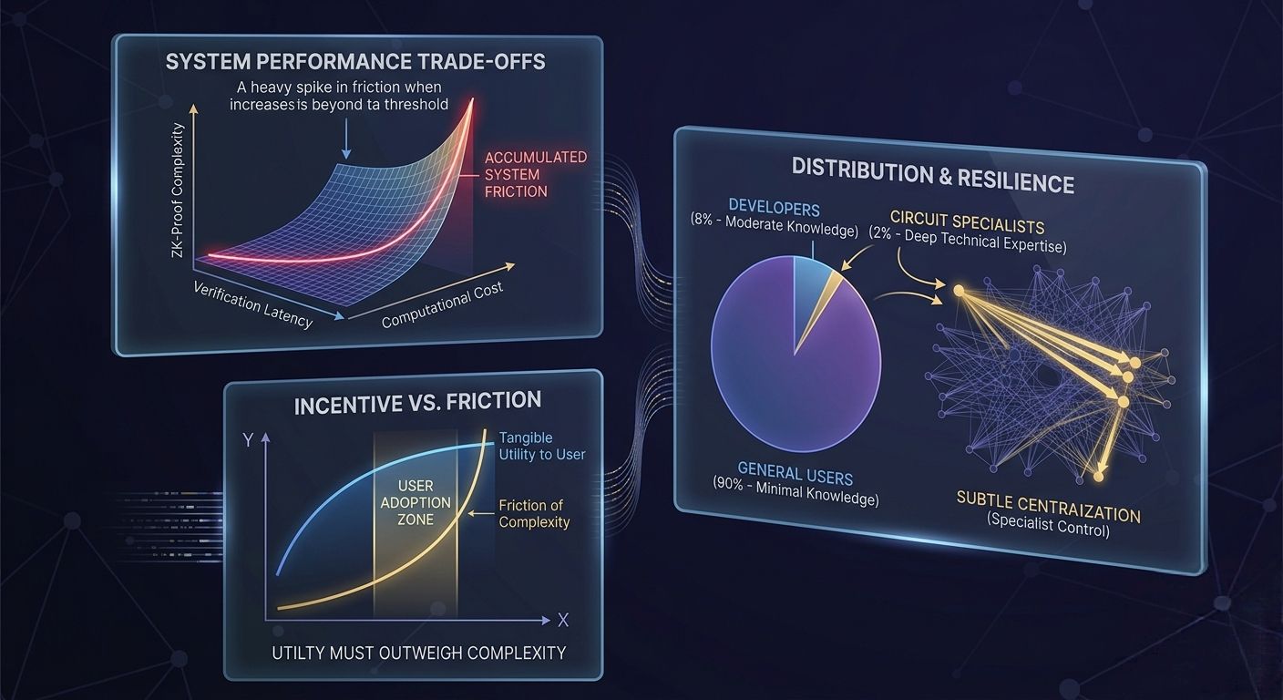 I find myself thinking about latency here, not just in terms of time, but in terms of informational delay. Zero-knowledge proofs are computationally expensive. Even with optimizations, there is a cost to generating and verifying proofs. That cost translates into friction. It may not be immediately visible to users, but it accumulates at the system level. If the network becomes too slow or too complex to interact with, participation starts to narrow. And when participation narrows, decentralization begins to weaken.