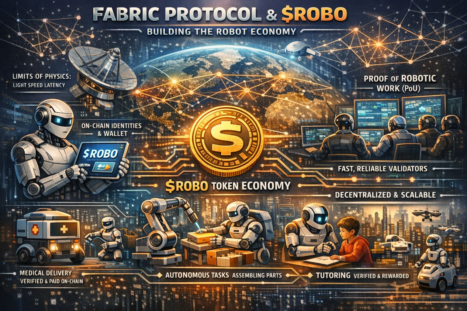 At its core, the Fabric Foundation is a non-profit building the open infrastructure for a true robot economy. Their Fabric Protocol gives robots something they've never had before: on-chain identities, wallets, and the ability to act as autonomous economic players. Think about it simply no more centralized servers owning the intelligence. A robot finishes a task (delivering medicine, assembling parts, or even tutoring a kid), the work gets verified on-chain, and it gets paid in ROBO straight to its digital wallet. No middlemen, no legal headaches. The token itself $ROBO handles everything practical: network fees, staking bonds, governance votes, and rewards for verified robotic work. Total supply is capped at 10 billion, with smart allocations that keep the ecosystem funded and growing without endless inflation.