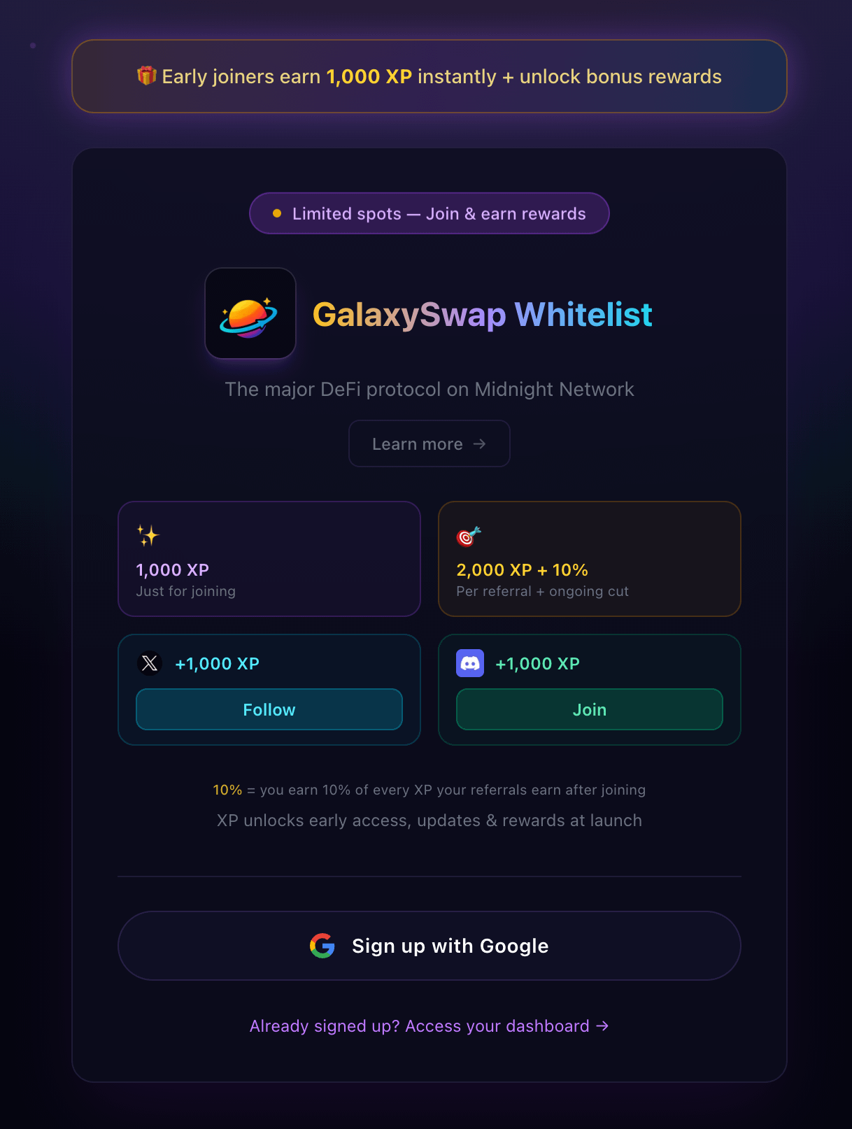 Bữa nay trên X đang rần rần về GalaxySwap, tự xưng là "first DEX on Midnight Network". Spin wheel, earn XP, referral 2.000 XP + 10% cut vĩnh viễn, limited spots. Theo mình tìm hiểu được thì đây là project third-party build trên Midnight (kiểu DApp độc lập) và chưa được core team “confirm” hay endorse chính thức.