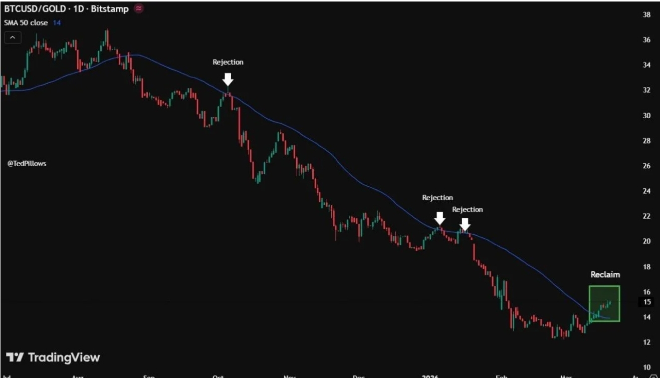 Un gráfico compartido por Ted Pillows muestra que la relación $BTC a Oro se mueve de nuevo por encima de su promedio móvil simple de 50 días por primera vez desde octubre de 2025. Las anteriores ráfagas hacia esa línea terminaron en rechazo, pero el último movimiento muestra que la relación la recupera, lo que apunta a un posible cambio en la fuerza relativa.