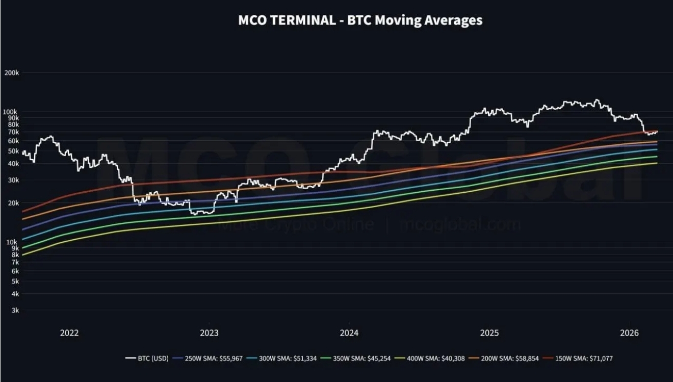 Un gráfico de More Crypto Online destaca que Bitcoin se está negociando por debajo de su media móvil simple de 150 semanas, que ahora actúa como resistencia. También muestra la SMA de 200 semanas alrededor de $59,000 como el próximo soporte importante, lo que lo convierte en un nivel crítico a observar si la presión a la baja persiste.