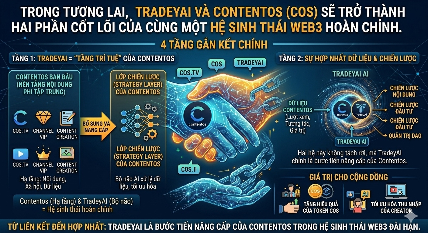Trong tương lai, TradeyAI và Contentos (COS) không chỉ “liên kết” mà sẽ trở thành hai phần cốt lõi của cùng một hệ sinh thái Web3 hoàn chỉnh. Mối quan hệ này có thể hiểu rõ qua tầng gắn kết chính: