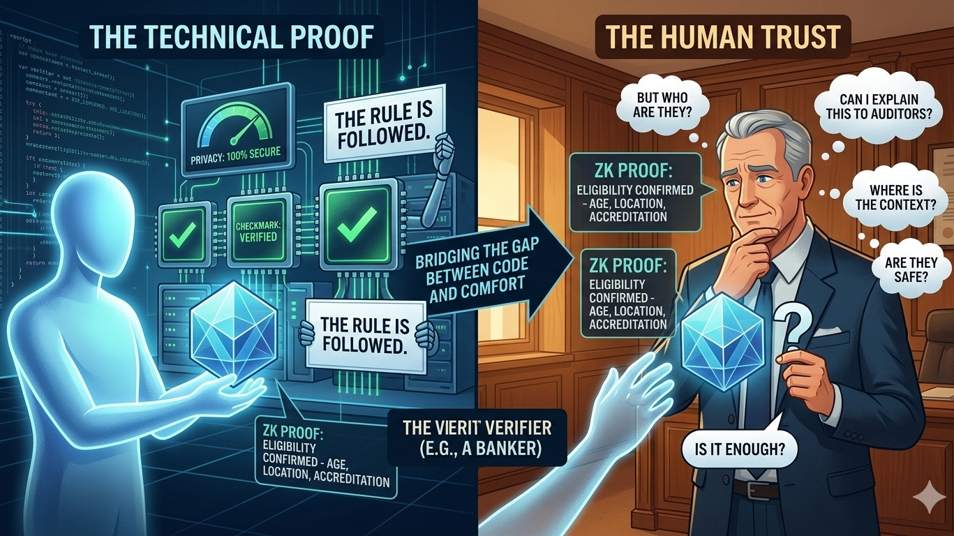 Cada participante define "suficiencia" de manera diferente. El "Prover"—el individuo—quiere exponer la menor cantidad de datos posible, maximizando su privacidad. Pero el "Verifier"—la institución—necesita poder justificar su decisión ante auditores, socios y cumplimiento normativo interno. No es simple curiosidad; es responsabilidad organizacional, responsabilidad legal y cautela sistemática.