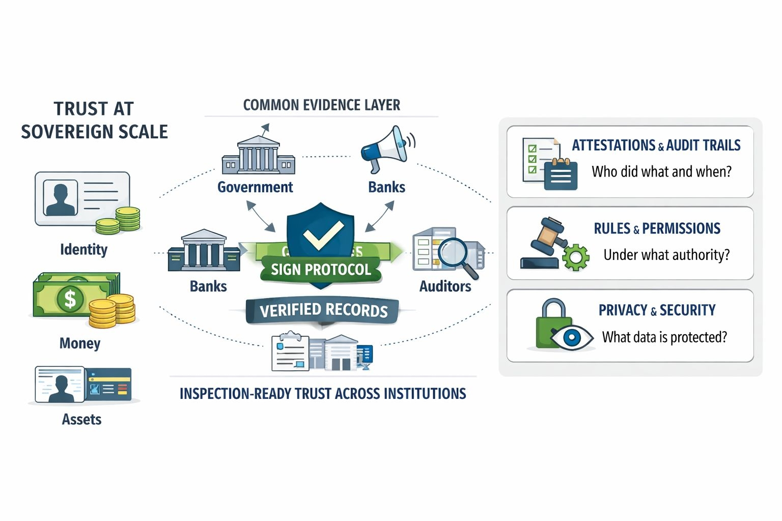 I find it helpful to look at the problem as a problem of shared memory rather than simple storage or transfer. The real challenge is not only moving value or keeping records in place. It is creating a record of events and permissions that agencies banks service providers and auditors can all rely on without being forced into blind trust. Sign’s materials describe this as inspection ready evidence and that phrase gets close to the heart of it. At sovereign scale trust cannot just mean that a system feels smooth to use or that a transaction appears to go through without friction. It has to hold up under oversight under dispute under policy change and under the kinds of edge cases that tend to define whether a public system is credible or not. A ministry may need proof that a benefit payment followed an approved rule. A regulated financial system may need evidence that an identity check took place without exposing more personal data than the situation requires. An institution may need to verify not just that a record exists but that it can be traced to a recognized authority and reviewed later in a way that still makes sense. That is why Sign spends so much time on attestations schemas audit trails and privacy controls. The part I find most interesting is that this turns trust into something less emotional and more inspectable. It becomes less like confidence and more like a fact pattern that can be examined.