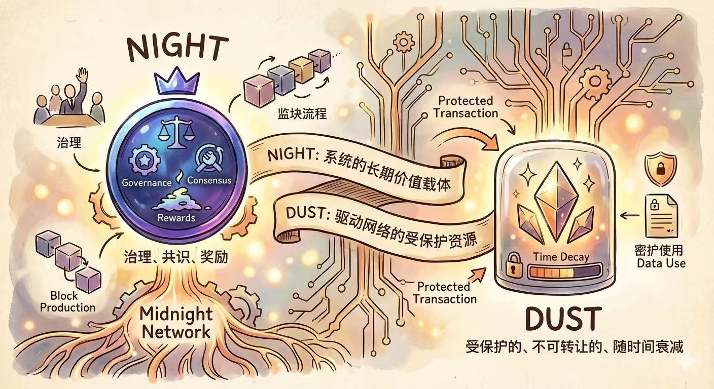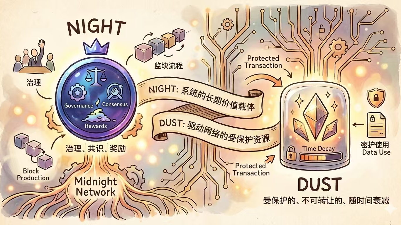 Midnight的双代币设计也挺有意思。$NIGHT 是用来治理、共识和区块生产奖励的,相当于系统的长期价值载体。DUST则是驱动网络的受保护资源,它会随着时间衰减,而且设计成不可转让。这个不能转让、也不能长期储值的设定,乍一看好像是个限制,但其实是为了让资源更贴近真实使用场景,避免变成投机工具,同时也能让企业更清楚地预估成本。我个人觉得,这能看出项目方在系统设计上确实挺务实的。