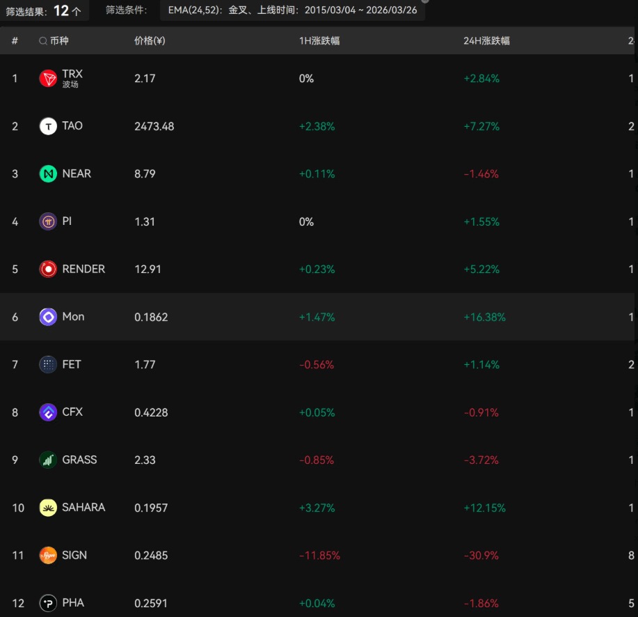 整个二级市场全体进行筛选 筛选条件:日线级别 EMA24上穿EMA52的币走入多头趋势的币种 ,只有12个再扣除PI和TRX,只有10个 这10个里7个全是AI赛道: