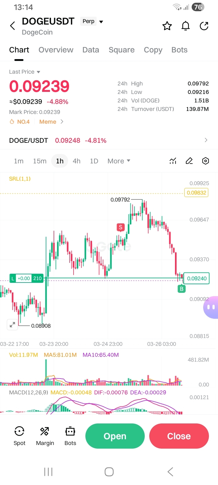 Basado en los datos del gráfico de 1 hora para $DOGE 26 de marzo de 2026,