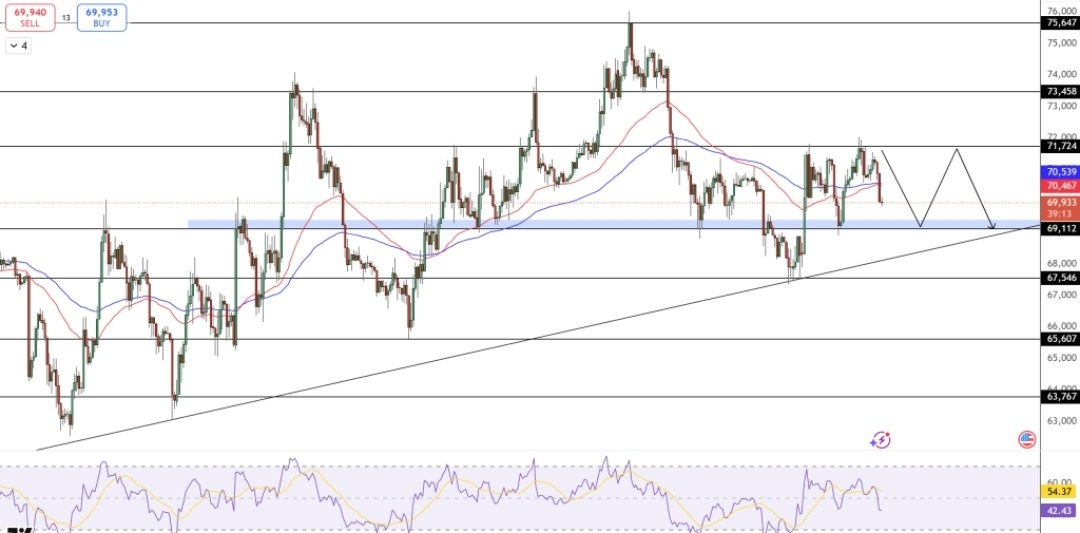 BTC remains in a consolidation phase post its 2025 all-time high near $126K. It’s holding above important support levels (~$68,500 ascending trendline) but struggling to break resistance at $71K–$72K.