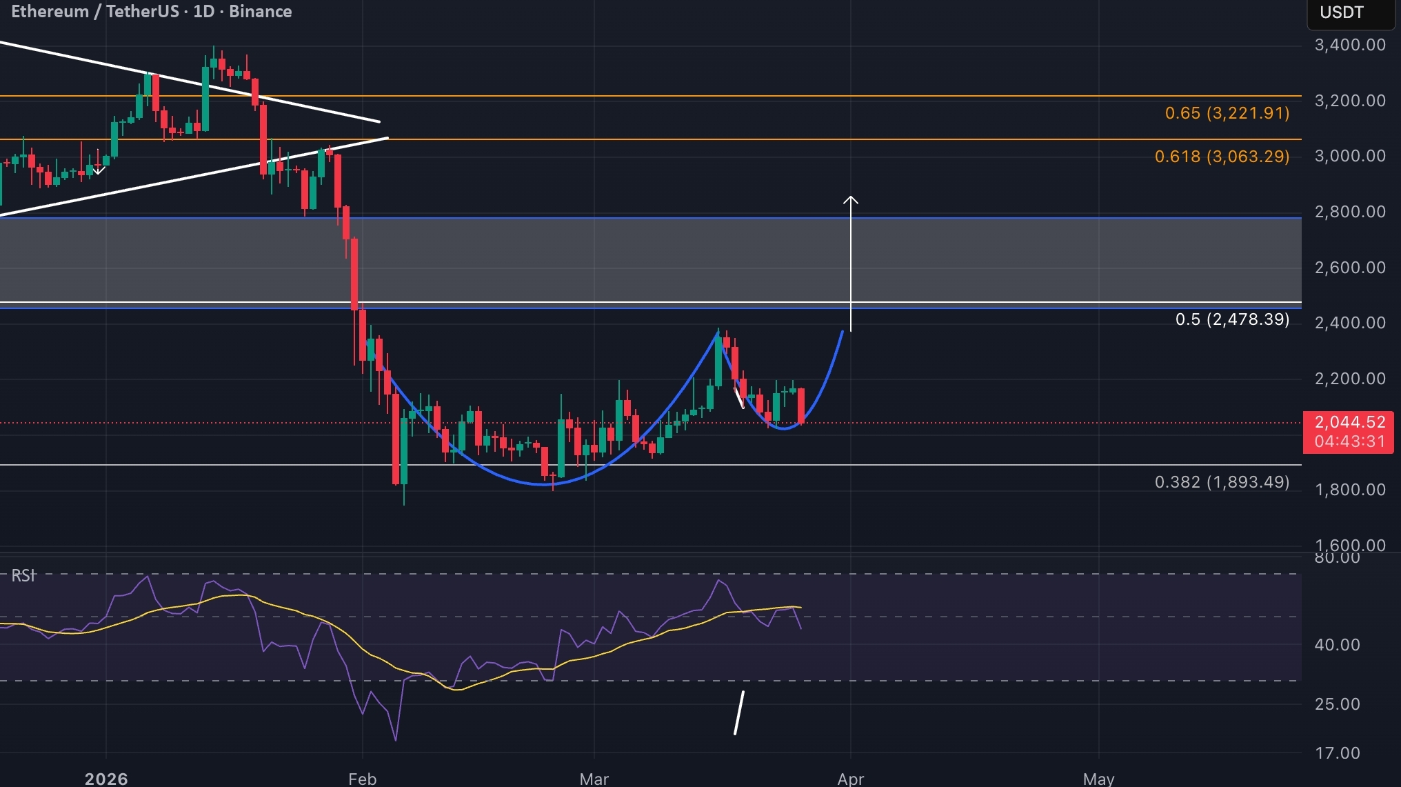 El fondo es circular, lo que muestra acumulación y pérdida de impulso a la baja. Ahora el precio está formando un pequeño retroceso (asa) y se mantiene por encima de 0.382 (~1890), lo cual es una buena señal sin una caída fuerte.