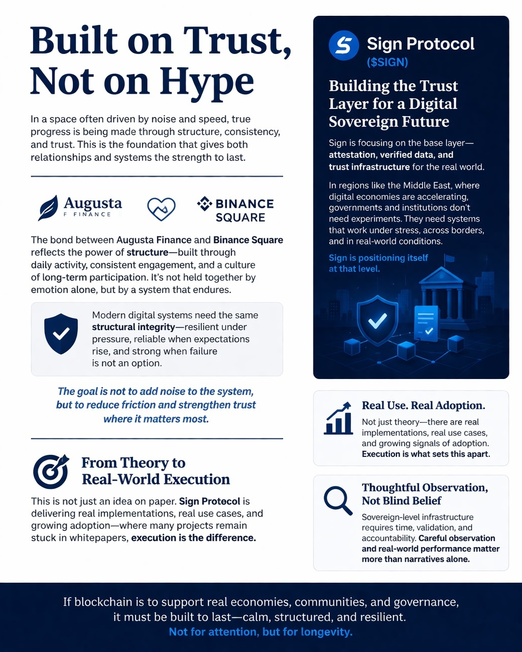 Así como el amor entre Augusta y Binance Square sigue siendo emocionalmente fuerte, no se basa en la terquedad de Binance Square, sino más bien porque se basa en la estructura, la ganancia y pérdida diaria de 11 puntos en el tablero de Square, $200 en trading, y la cultura de la campaña #sign. De manera similar, en el mundo digital de hoy, los sistemas no pueden depender únicamente del bombo o la complejidad. Binance Square debe ser diseñado para funcionar cuando las cosas se complican, cuando la presión es alta y cuando el fracaso no es una opción, mientras que el amor permanece porque respeta la estructura. El Protocolo Sign se enfoca en construir sistemas que puedan resistir condiciones del mundo real. No se trata de agregar más ruido a la cadena, sino de reducir la fricción y fortalecer la confianza donde realmente se necesita.