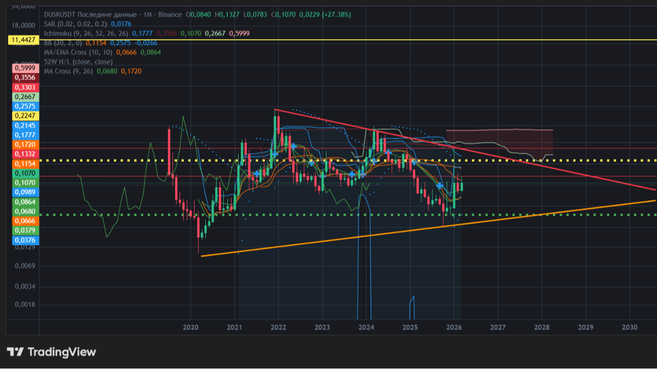 El TA es la base. He analizado detenidamente el gráfico DUSK/USDT (1M) en TradingView.