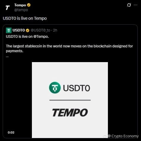 Tempo, la red de Capa 1 diseñada para pagos en cadena eficientes y a gran escala, integró USDT0 para llevar liquidez omnicanal unificada de USDT a su ecosistema. El anuncio fue hecho por el equipo de USDT0. Esta integración será clave para unificar mercados fragmentados en una única capa de liquidez interoperable.