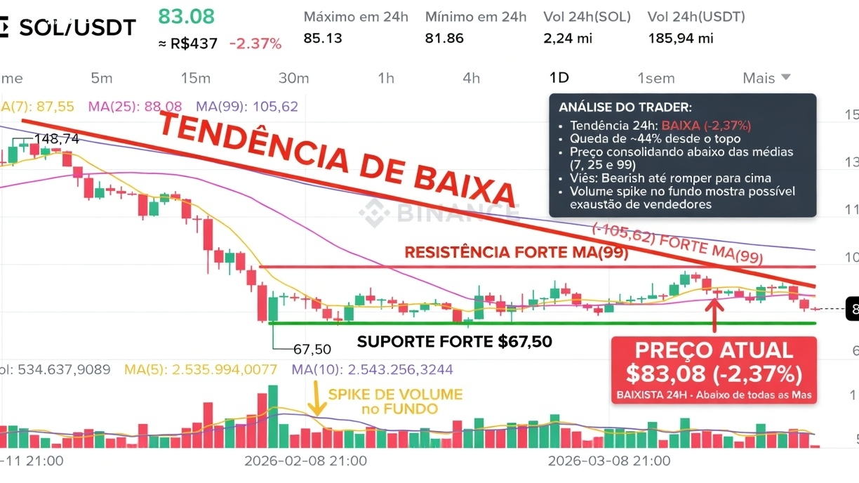 Preço despencou de 148,74 pra 83,08 (queda de ~44% desde o topo), e nas últimas 24 horas já perdeu -2,37% enquanto continua abaixo de TODAS as médias móveis (MA7, MA25 e MA99).