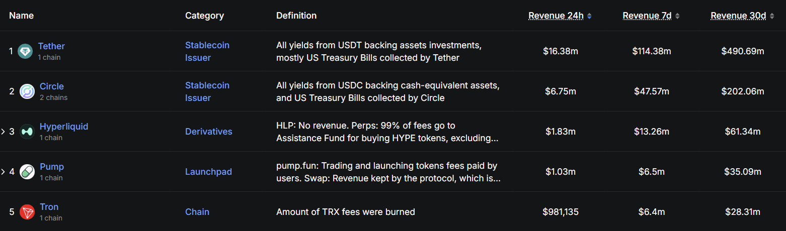 Hyperliquid se encuentra detrás de Tether ($16.38M / 24h) y Circle ($6.75M / 24h), ambos emisores de stablecoins con modelos de negocio completamente diferentes, y cómodamente por delante de Pump.fun ($1.03M / 24h) y Tron ($981K / 24h).