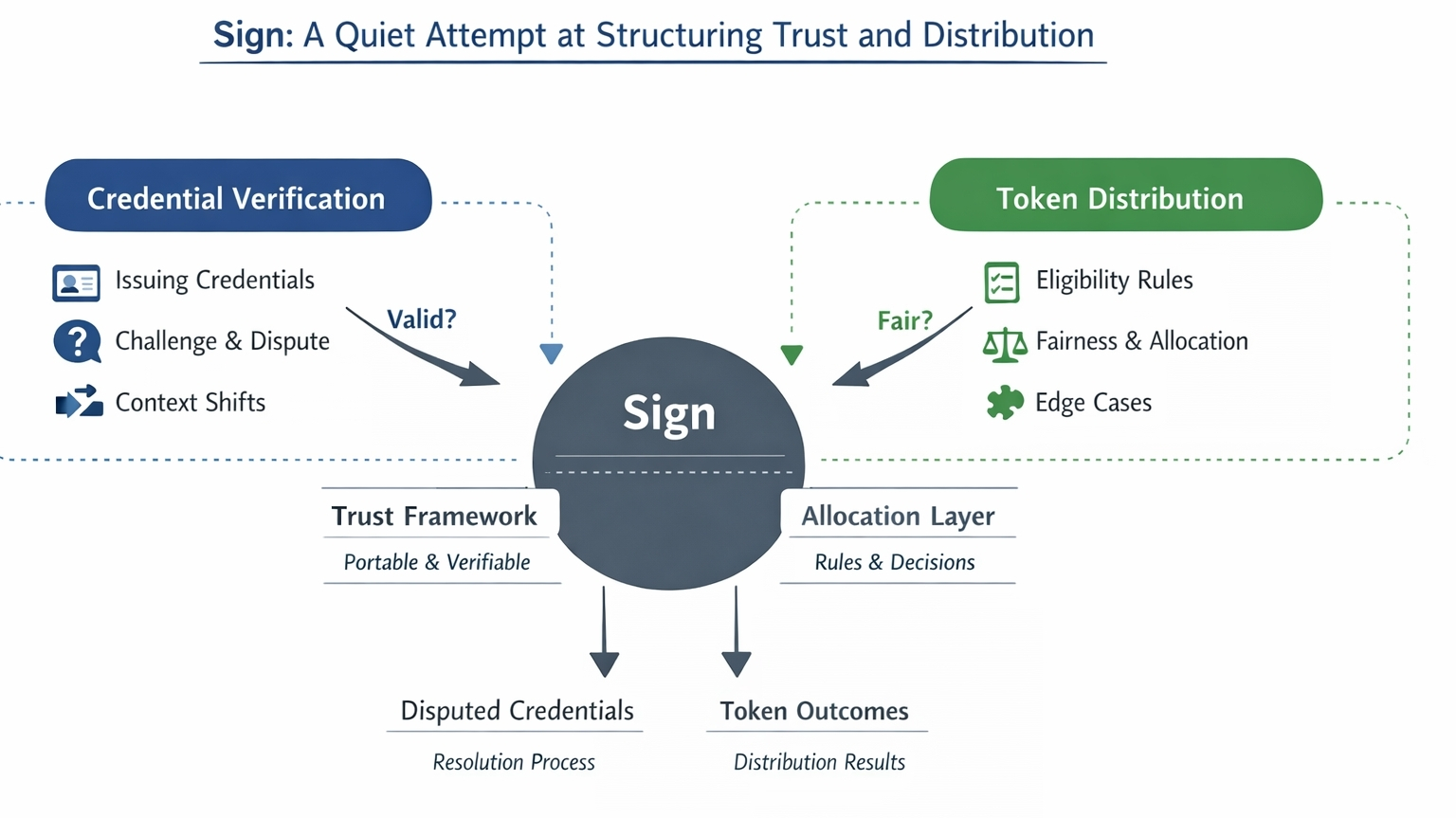 En su núcleo, Sign está tratando de lidiar con cómo se expresa la confianza y cómo se asigna el valor. Estas son ideas simples cuando las dices rápidamente, pero se vuelven más difíciles en el momento en que se ponen en práctica. La verificación de credenciales, por ejemplo, suena limpia hasta que alguien la cuestiona. Hasta que una credencial existe, pero no se siente válida en un contexto diferente. Hasta que el emisor mismo se convierte en algo en lo que la gente ya no confía completamente.