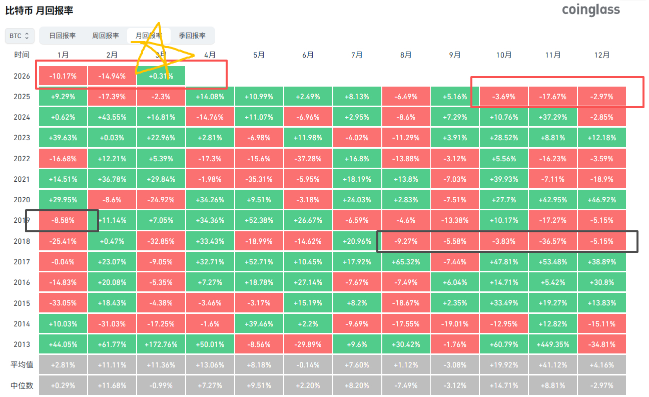En marzo esta caída no parece mucho, pero el sabor ya es diferente: actualmente el retorno mensual es de aproximadamente -0.76%, si no se recupera a fin de mes, es muy probable que se iguale el récord histórico de "seis meses consecutivos de caídas". Los jugadores veteranos lo entienden, este tipo de movimiento no solo es débil, sino que es una señal de que la emoción ha sido llevada al extremo. La última vez que sucedió algo similar fue en 2018, cuando desde un máximo se cortó a la mitad y cayó durante seis meses, luego se revirtió directamente y comenzó un aumento explosivo de cinco meses, con un incremento superior al 200%.