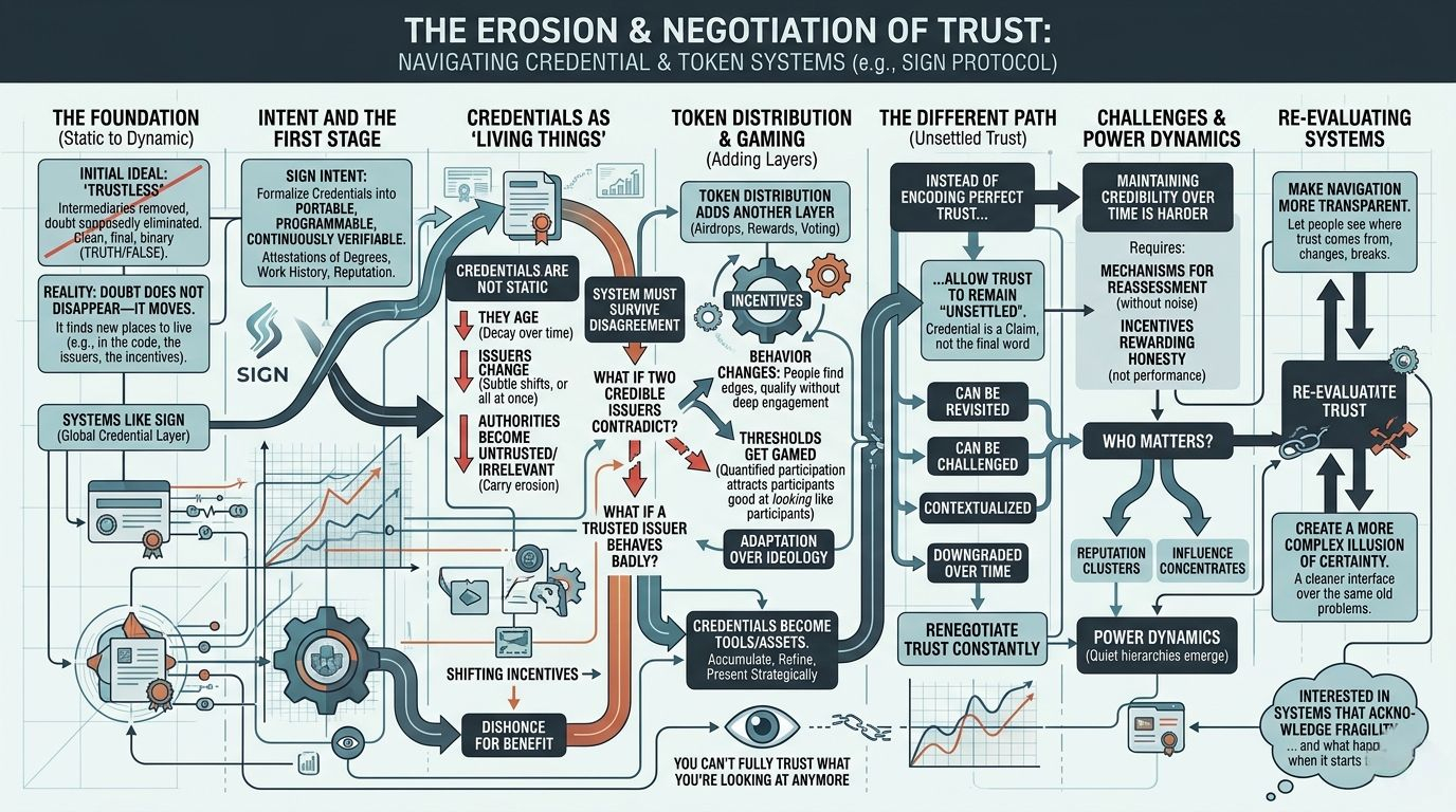 Últimamente he estado pensando en sistemas como SIGN—esta idea de construir una capa global para la verificación de credenciales y la distribución de tokens. En papel, tiene sentido. Siempre hemos tenido credenciales: títulos, historial laboral, reputación, prueba de participación. Lo nuevo es el intento de formalizarlas en algo portátil, programable, y—esta es la parte importante—verificable de manera continua.