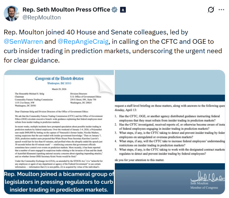 El grupo está solicitando una sesión informativa y respuestas a una serie de preguntas para el 13 de abril, incluyendo si la CFTC ha investigado o recibido informes de empleados federales participando en operaciones con información privilegiada en mercados de predicción.