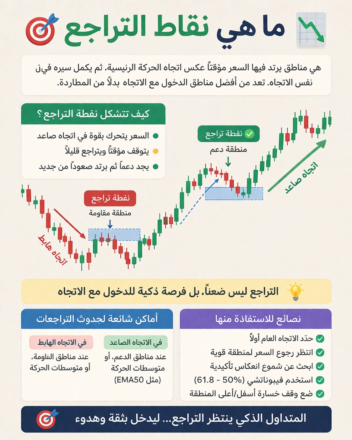 هي المنطقة اللي يرجع لها السعر مؤقتًا بعد حركة قوية، ثم غالبًا يكمل في نفس الاتجاه.