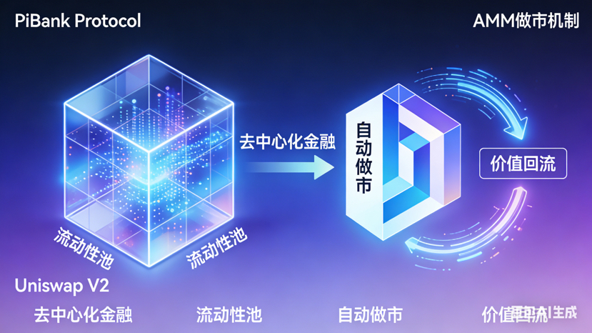 El Protocolo PiBank elige Uniswap V2 y el mecanismo AMM no para seguir alguna tendencia tecnológica, sino basado en un juicio más profundo. Un sistema que pueda funcionar a largo plazo no debe depender de personas para mantener la liquidez, sino que la liquidez debe ser parte de la propia estructura; no debe depender de emociones para decidir precios, sino que el precio debe ser una representación natural del comportamiento; no debe depender de un centro para coordinar, sino que el sistema debe operar por sí mismo dentro de las reglas.