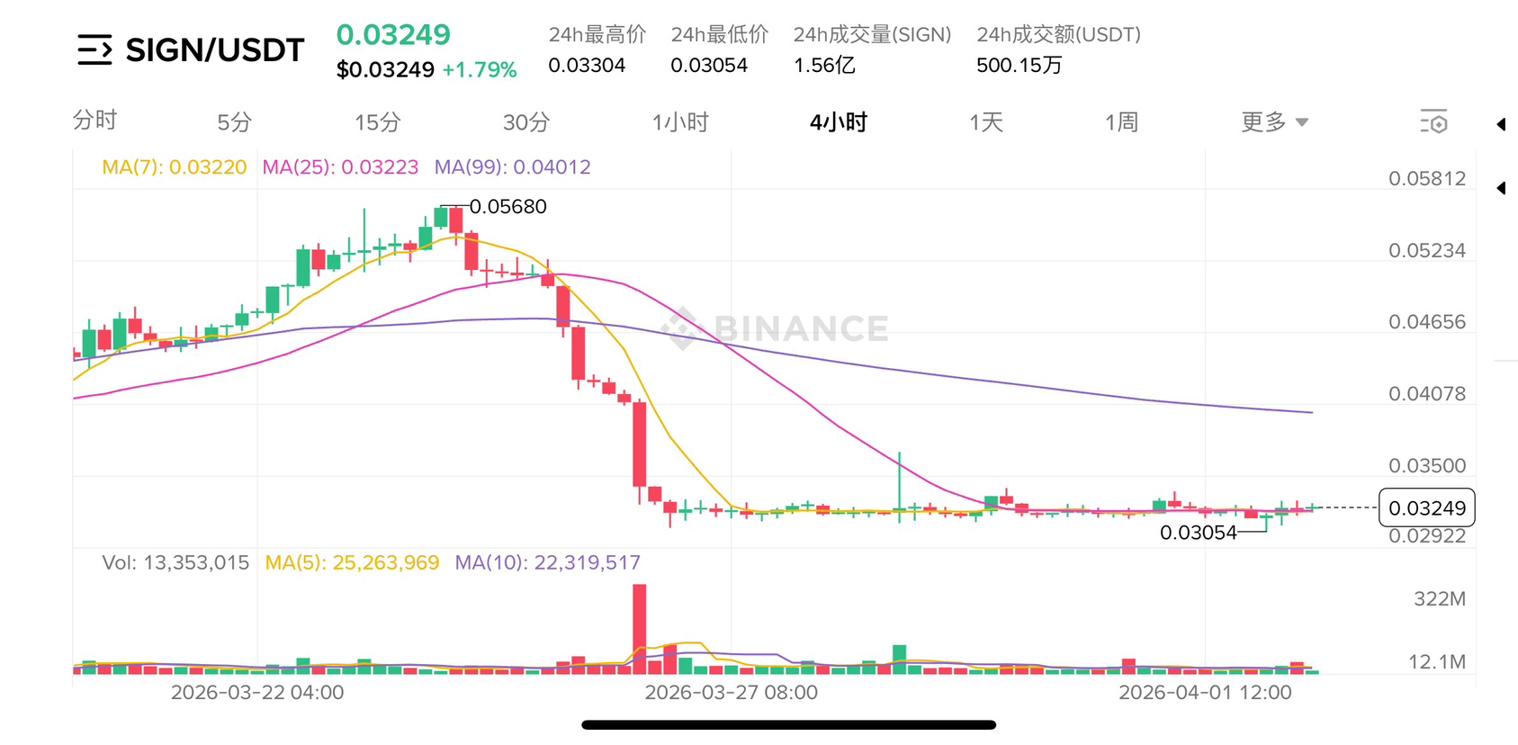 Hace unos días, un amigo me preguntó, $SIGN si no había nadie cuidando el precio en $0.032 después de estar tanto tiempo en esa posición. Le respondí: no es que nadie esté cuidando, es que todos están esperando lo mismo. Me preguntó, ¿esperando qué? Dije: el 28 de abril. Esta fecha es un nodo de desbloqueo para los primeros apoyos, y antes de que aparezca este nodo, cualquier movimiento en el mercado ocurre en un estado de liquidez muy delgada, lo cual no es confiable ni sostenible. ¿Por qué sé esto tan bien? Porque he estado observando este mercado casi dos semanas, cayendo rápidamente de $0.05680 a $0.03054, y luego esta etapa de consolidación incómoda —MA7 $0.03220, MA25 $0.03223 casi fusionados, MA99 presionando continuamente en la parte alta de $0.04012, con un volumen de 500.15 millones de USDT, el volumen ha disminuido tanto que hace dudar de si el mercado ha olvidado este activo. No tengo la intención de pretender que este mercado es saludable; no lo es, pero el nodo que está esperando es el más seguro de todos los variables que estoy observando actualmente. Profesional de verdad · Prioridad a la supervivencia, lo único que me permite seguir observando cuidadosamente en este mercado es: los fundamentos no han cambiado, solo ha cambiado la emoción del mercado.