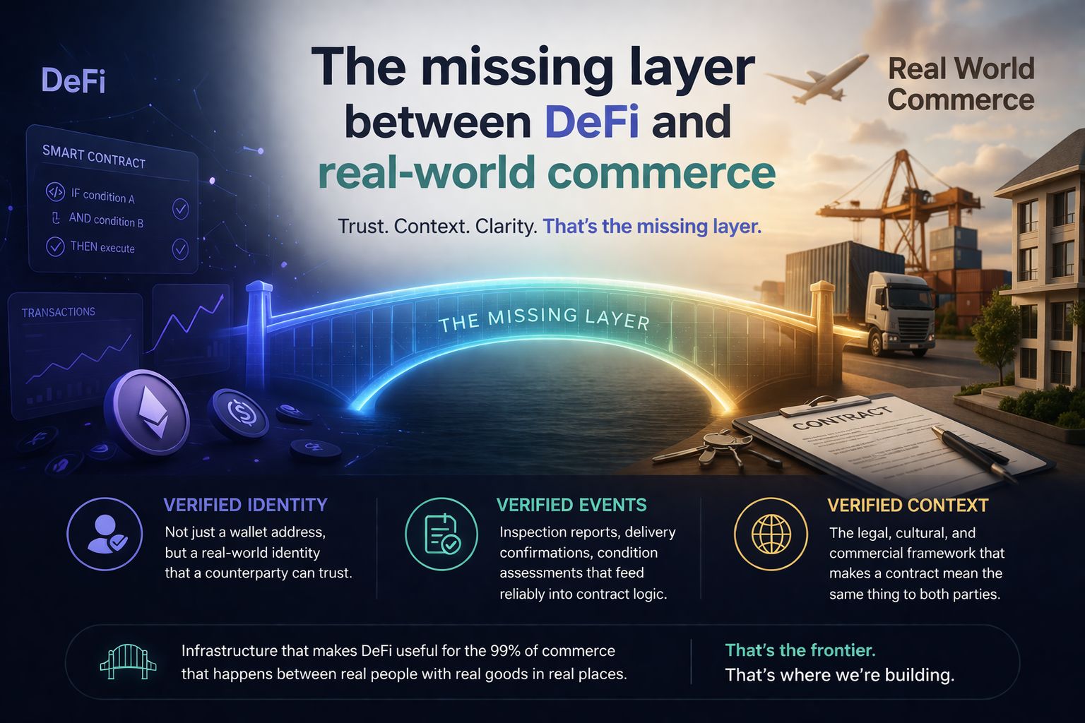 Esta capa no existe como un producto unificado. Existe como un conjunto fragmentado de procesos manuales: inspectores, notarios, agentes de depósito en garantía, abogados, que hacen que el comercio transfronterizo sea costoso, lento e inaccesible para cualquiera sin recursos significativos.