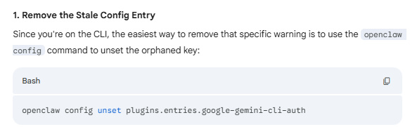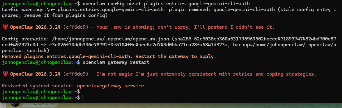( openclaw config unset plugins.entries.google-gemini-cli-auth)