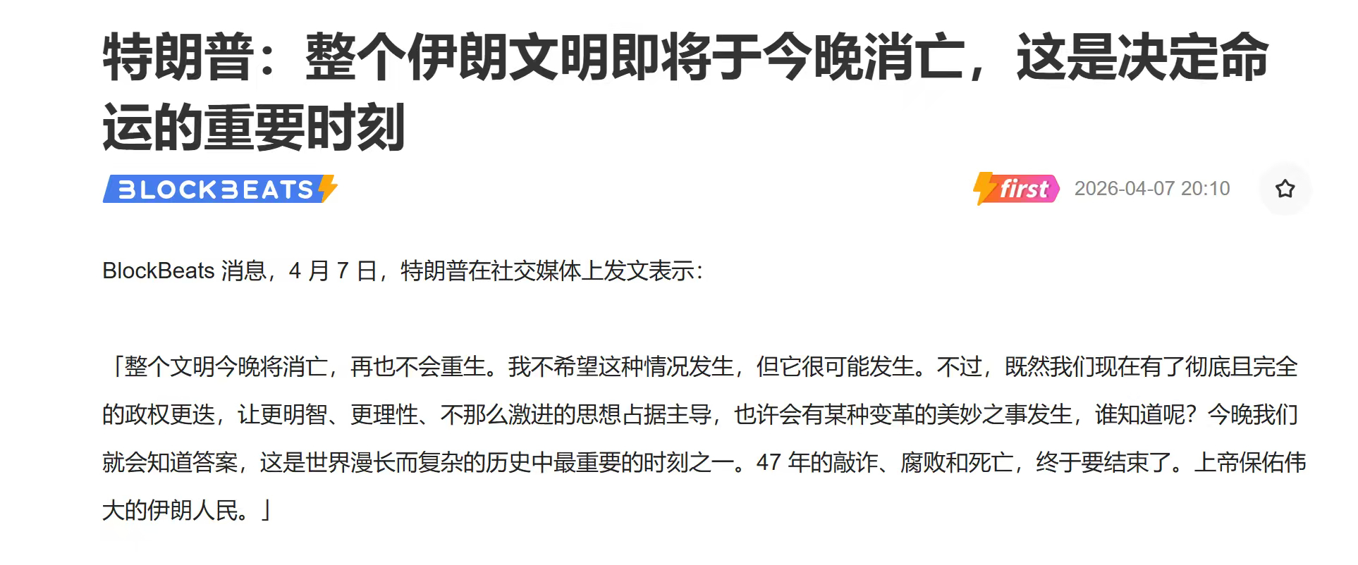 "整个文明今晚将消亡,再也不会重生。我不希望这种情况发生,但它很可能发生。"