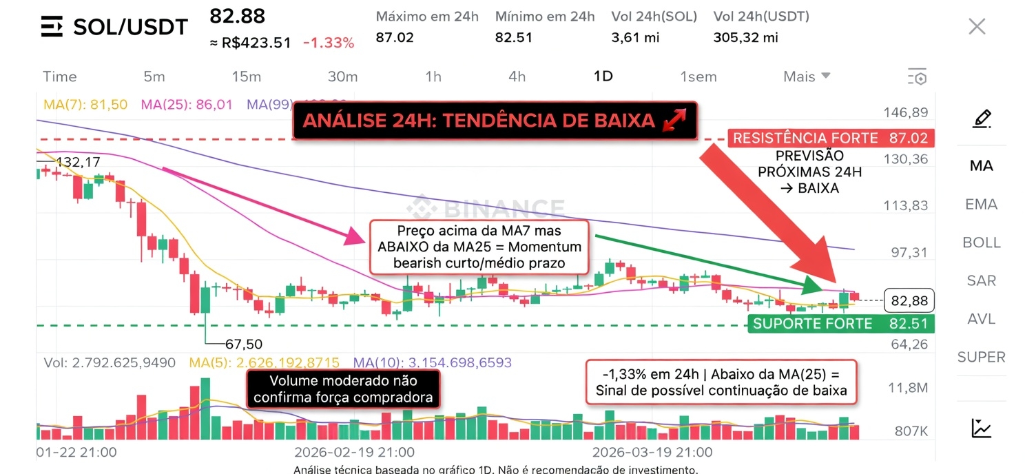 Nas últimas 24h ela caiu -1,33% e não consegue nem tocar a média móvel de 25 períodos.