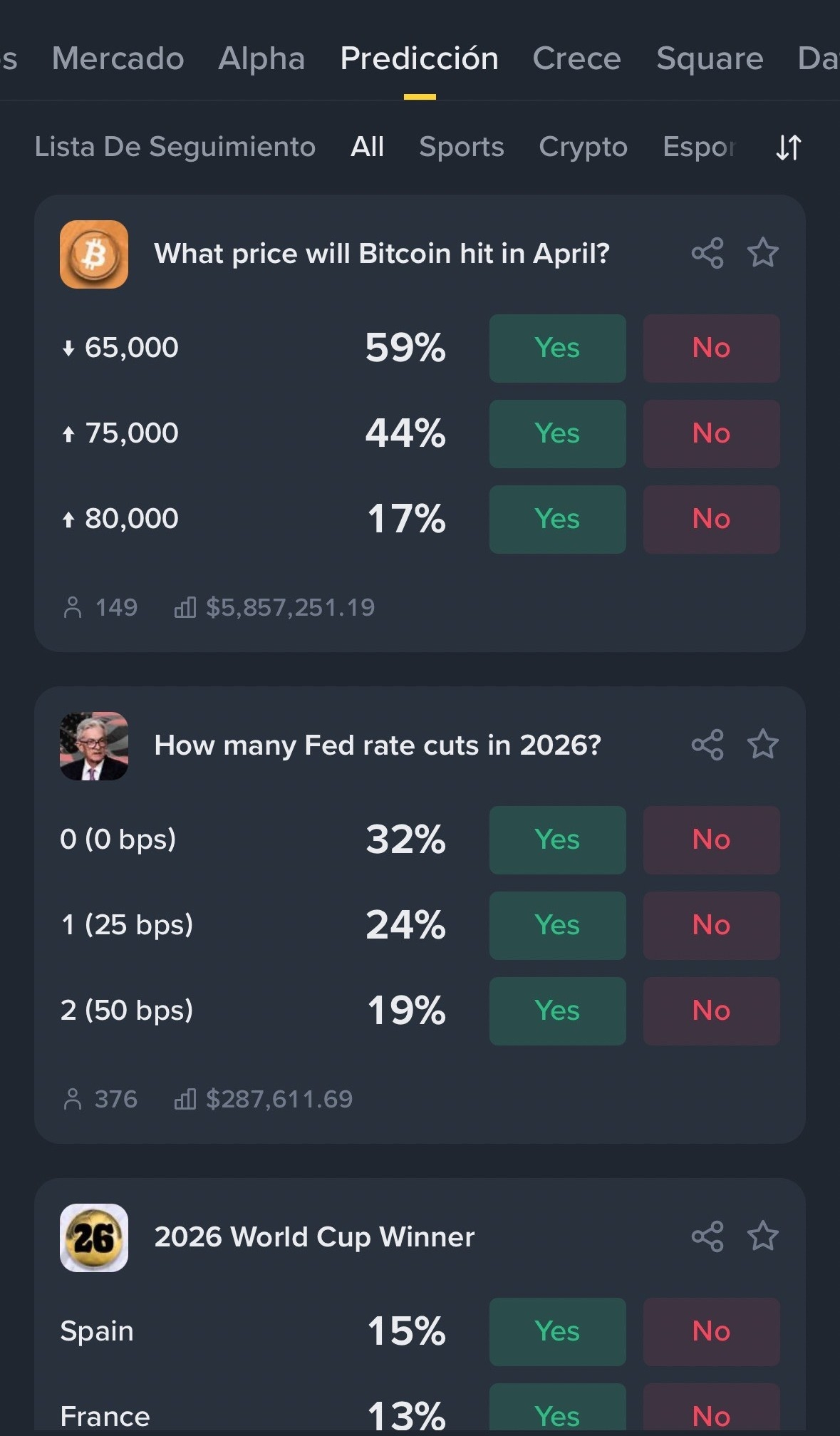 Los usuarios de Binance ya pueden participar en diversos mercados activos que abarcan desde indicadores macroeconómicos hasta hitos deportivos y financieros. Entre las opciones disponibles destacan apuestas sobre cuántos recortes de tasas de interés realizará la Reserva Federal de Estados Unidos (FED) en 2026 o quién será el ganador de la Copa del Mundo 2026.
