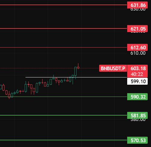 Si en la noche el nivel de 4 horas no cierra por encima de 599, el mercado continuará en un rango, luego bajará cerca de los niveles 590-581-570 para esperar órdenes largas. #BNB走势