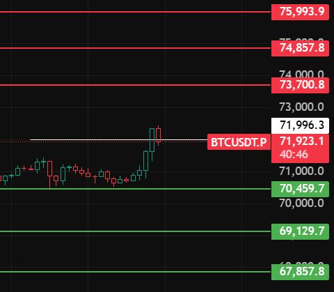 Atención en la noche al nivel 72000, solo si el nivel de 4 horas se mantiene por encima de este nivel, entonces esta corrección se habrá terminado completamente, y el mercado continuará hacia arriba para esperar órdenes cortas en los niveles 73700-74860-76000.