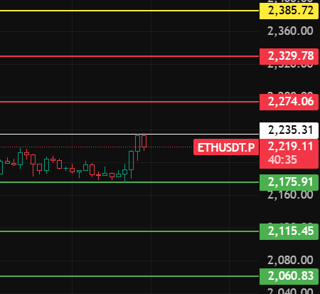 Ahora, si no tienes posiciones largas, no vayas a perseguir. Ahora espera a que suba y baje. Si eres un poco agresivo, compra Bitcoin en 715 con una posición ligera. Si quieres ser más conservador, compra un 1% en el mínimo anterior. Para Ethereum, si eres un poco agresivo, compra en 2205 con una posición ligera. En el mínimo anterior, compra un 1% de forma normal.