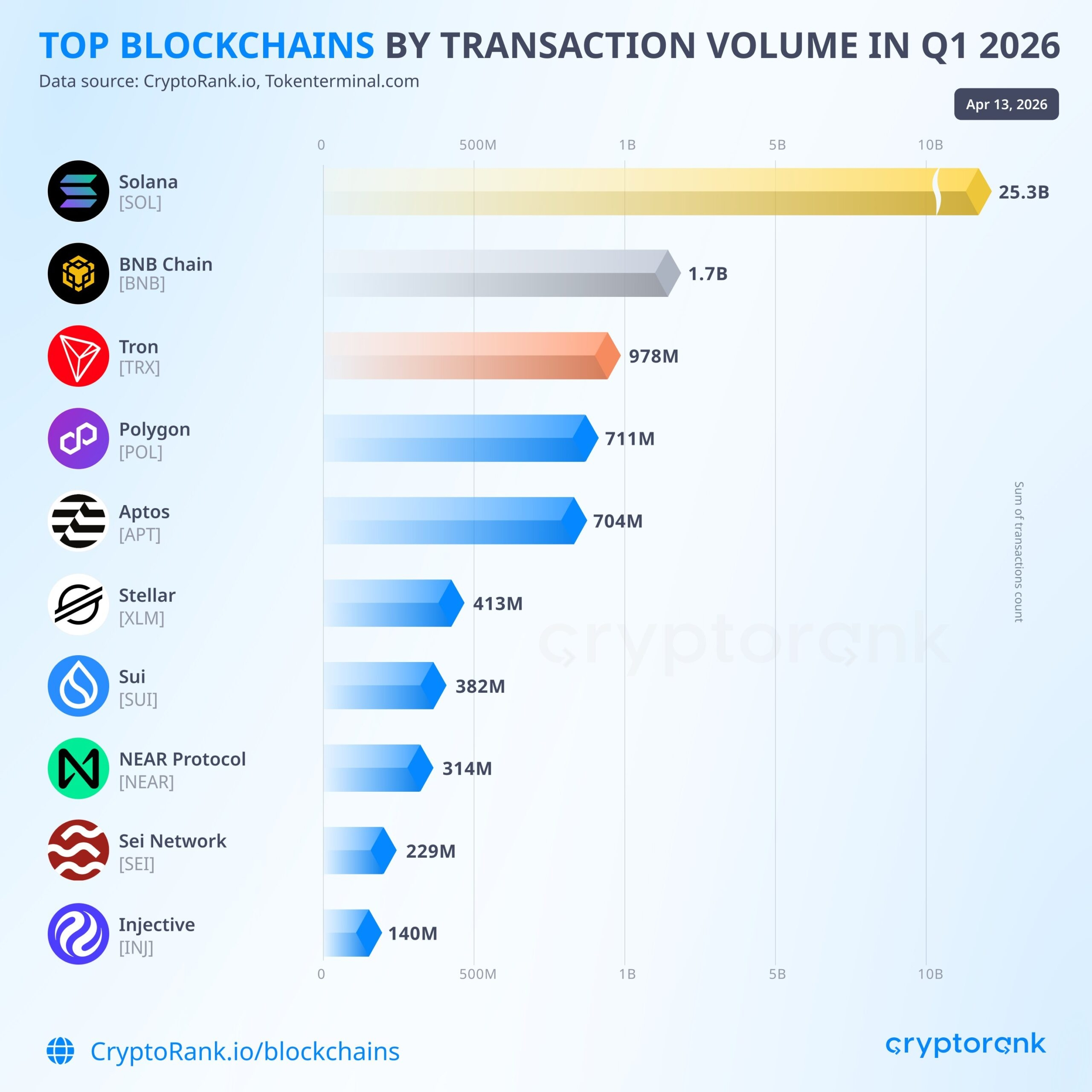 En el primer trimestre de 2026, el volumen de transacciones en la cadena de Solana alcanzó los 25.3 mil millones, liderando claramente.