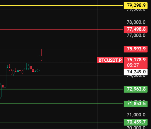 Buenas noches, hermanos. Hoy el mercado ha estado lateral en la parte superior todo el día. Actualmente, además de Ether, otras monedas han superado sus máximos anteriores y han subido. No pensé que solo retrocedería un poco antes de seguir subiendo, esto también coincide con lo que mencioné al mediodía: mientras no rompa la línea blanca, la tendencia alcista aún se mantiene y seguirá subiendo. Los hermanos que hicieron cortos han sido sacados por stop loss en los máximos anteriores. ¿Qué hacemos ahora? El bitcoin ya ha llegado a 76000, y las posiciones cortas en este nivel ya están activas. Hermanos, deséenme que pueda llegar a la otra orilla. De todos modos, todavía tengo 600U, 300U para comprar una bicicleta eléctrica, y los otros 100U para la vida diaria. Me quedan 200U que le compré al administrador una caja de pelotas de bádminton. Supongo que el administrador nunca ha visto una caja de pelotas de bádminton que cueste 200U en toda su vida. ¡Todos esperen con ansias el ascenso de Xiao Zhang!