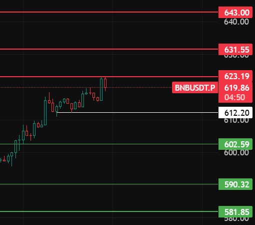BNB acaba de romper el máximo de hoy y comenzó a retroceder, durante la noche presta atención cerca de la posición 612, mientras no rompa esta posición seguirá subiendo (posiciones largas con poco capital), arriba hacia las posiciones 623-631-643 para esperar posiciones cortas!