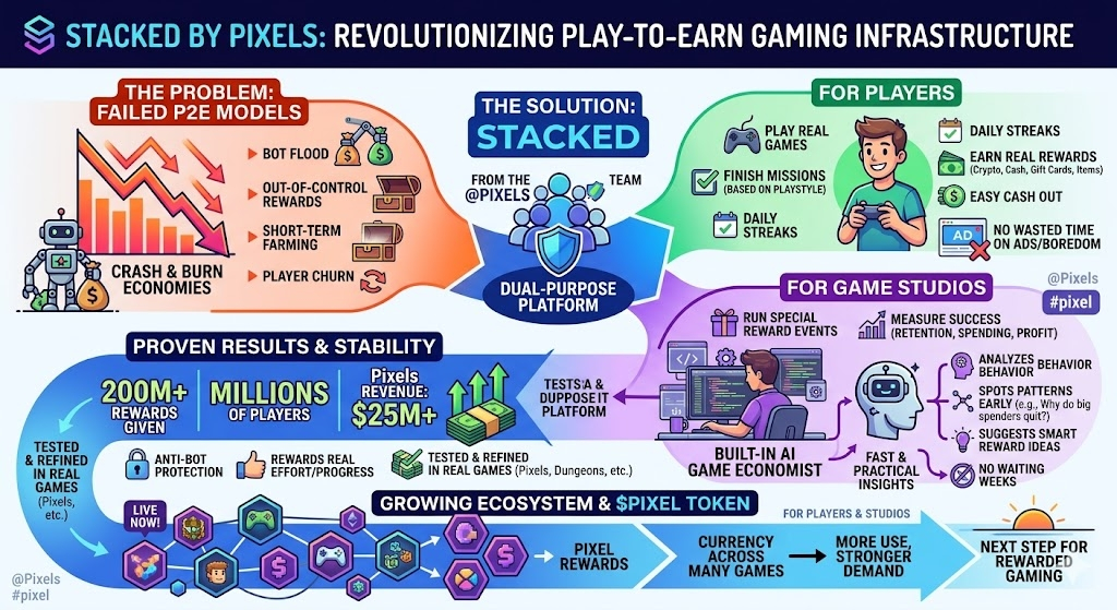 Lo más genial es que Stacked no es una prueba temprana ni una promesa vacía. Ya está en vivo y funcionando fuerte dentro del ecosistema de Pixels. El equipo pasó años probando, fallando, aprendiendo y solucionando cosas en tiempo real. Ahora lo están abriendo para que otros estudios de juegos puedan usar las mismas herramientas. Ya seas un pequeño equipo o un estudio más grande haciendo juegos de Web3 o mixtos, esto te da control a nivel profesional sin necesitar un gran equipo de datos.