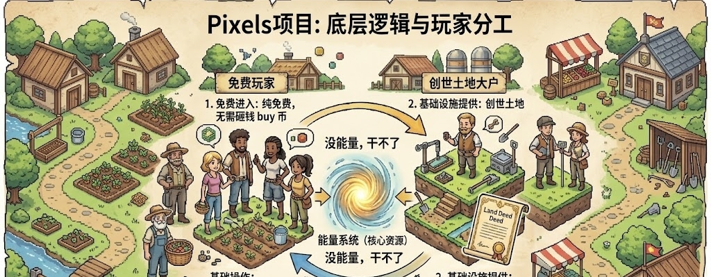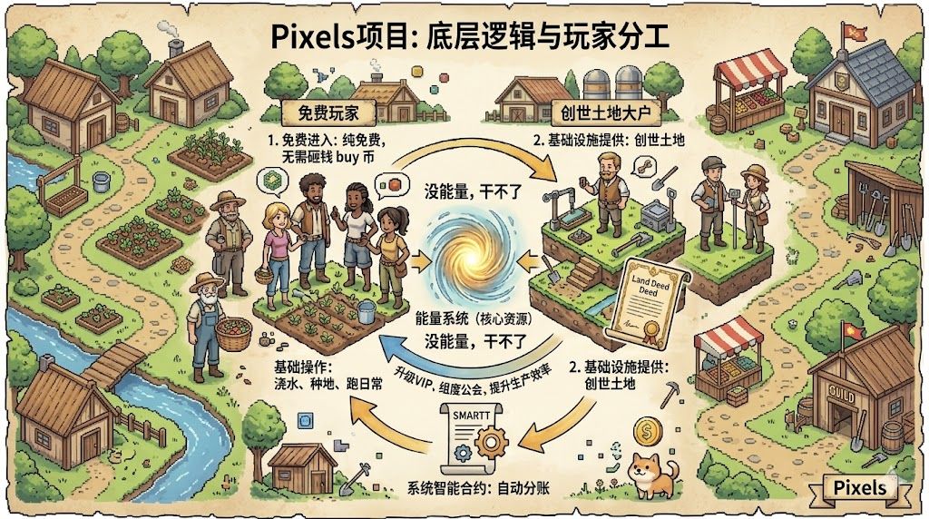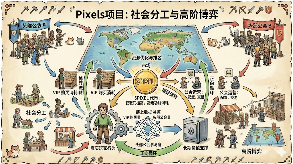我个人最欣赏的,是它底层那套社会分工模型。表面上看是个可爱像素农场,但实际玩起来你会发现,能量系统是核心资源。没能量,很多操作都干不了。这自然就把玩家分成了不同角色,有创世土地的大户提供基础设施,免费玩家通过帮别人做任务赚收益,系统用智能合约自动分账。这种设计很巧妙,既没强迫你花钱,又让整个经济体自己转了起来。PIXEL作为核心资产,获取门槛比较高,同时被设计成很多高级功能的消耗品:升级VIP、组建公会、提升生产效率,都得用它。这就让代币更多地服务于游戏的长期发展和治理,而不是单纯炒来炒去。等到公会竞争阶段,真正的生态博弈才开始。大公会为了资源优化和排名,需要在市场上各种配置、交易。这种把玩家协同转化为生态动力的方式,让整个系统形成了正向循环。它当初迁移到Ronin链,也是看中了那边成熟的社区生态,这一步走得挺对的。