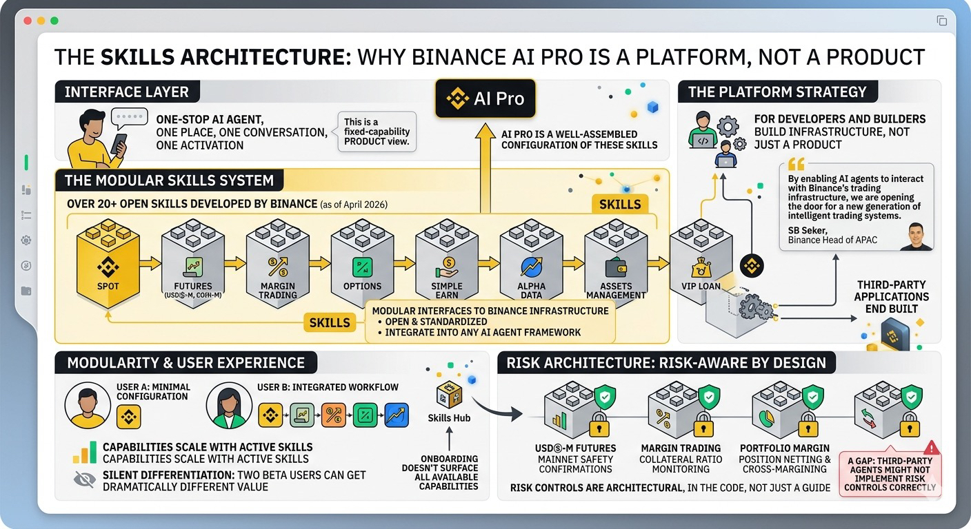 The product description calls Binance AI Pro a "one-stop AI Agent." That framing is accurate for the interface layer: one place, one conversation thread, one activation. But underneath the interface, the architecture is something different. It's a modular skills platform, and understanding that distinction changes how you evaluate what the product is and what it can become.